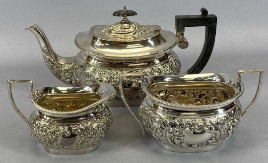 THREE VICTORIAN & LATER THREE-PIECE TEASETS IN EPBM AND EPNS, comprising a square form set with bright cut decoration, 14cms H, 27cms across, the teapot, segmented form set with bright cut decorations, 13cms H, 25cms across the teapot and a later embossed set in EPNS, 14.5cms H, 30cms across the teapot
