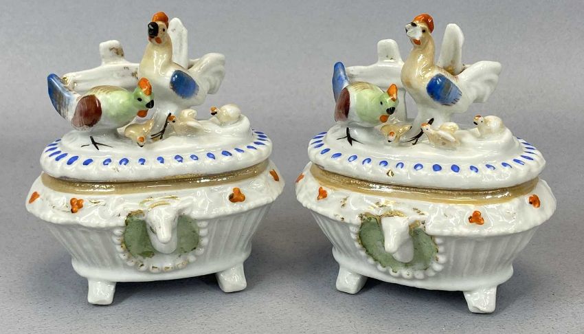 VICTORIAN & LATER ORNAMENTAL CABINET FIGURINES ETC, including 2 x good pin dishes with lids showing chickens with chicks, Aynsley and other porcelain floral sprays, KPM match holder depicting a boy seated on a dog, 10cms H, and other interesting items