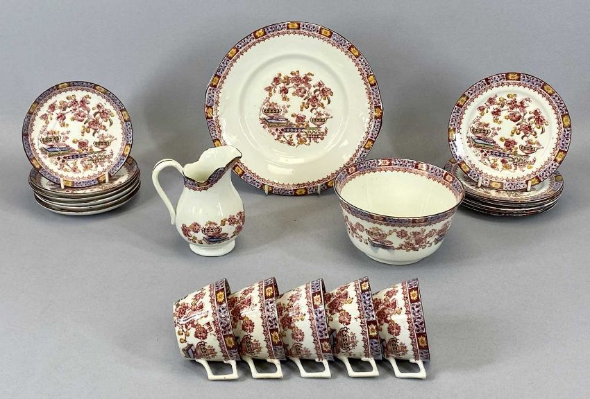 MIXED VINTAGE TEAWARE, PAIR OF BLUE & WHITE VASES & A PAIR OF ARTHUR WOOD HANDPAINTED JUGS, the two part teasets with floral decorations, one set in purple tones, 20 pieces, the other in rust tones with gilt highlighting, 39 pieces, 19cms H the vases, 21cms H the jugs