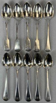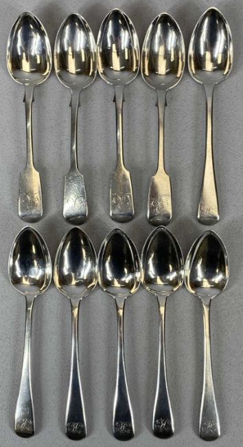 GEORGE IV & VICTORIAN MONOGRAMMED TEASPOONS (6+4) London 1823, John Harris IV and Exeter 1857, Josiah Williams & Co,14 and 13.5cms L, 6.6ozt gross,