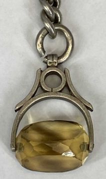 SILVER GRADUATING CURB LINK DOUBLE ALBERT, with silver mounted facet cut amber colour stone swivel fob and 2 x end clips, 39cms to end length, 25cms hanging length, 2.3ozt, 72.5gms gross (not including fob), 79.9gms gross
