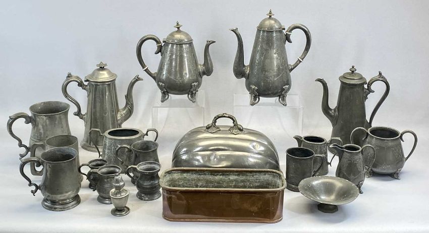 COLLECTION OF ANTIQUE PEWTER ITEMS, including quartz tankard, oval meat dish cover, 3 x coffee pots, baluster form measures ETCProvenance: private collection Gwynedd