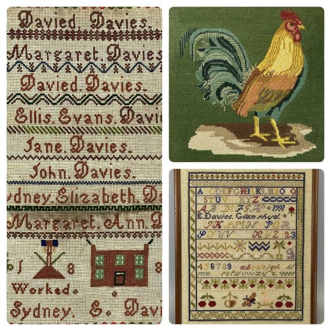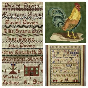 VICTORIAN & LATER WOOLWORK SAMPLERS AND TAPESTRY PICTURES (2+1) the larger sampler listing various family members, worked by Sydney Elizabeth Davies, aged 14, dated 1882, 43.5 x 42cms, the smaller with standard alphabet and numerical lines, along with tree, rabbit and other animal content, by E Davies, dated 1997, 35.5 x 28.5cms, the final item depicting a colourful cockerel, 39 x 39cms