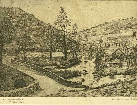 GWYNETH TOMOS limited edition (59/300) print - view in Blaenau Ffestiniog, 27 x 48.5cms, G MEIRION ROBERTS two early black and white prints - Bala, titled 'Llanfor Church', 11.5 x 17cms, and 'Rhos-y-Gwaliau', French print of Montmarte, unknown artist, 27 x 21cms, and one other limited edition (120/250) print - indistinct artist signature of Porth Meudwy, near Aberdaron, 18.5 x 41cms