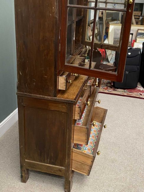ANTIQUE OAK & MAHOGANY CUPBOARD TOP CHEST, the upper section with twin arched top glazed doors and interior shelving, over three small drawers above a base section with edge moulding to the top, peg joined construction with two short and two long pine lined drawers, having brass knobs and escutcheons, with ogee bracket detail to the front, on stile feet, 216cms overall H, 109.5cms W, 47cms D Provenance: by descent, from a farmhouse Llyn Peninsula