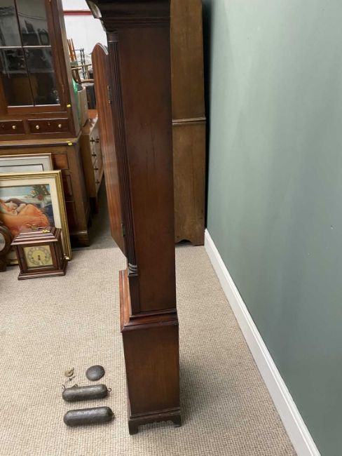GOOD 19TH CENTURY CIRCULAR DIAL MAHOGANY LONGCASE CLOCK, the 30cms diam. round dial with the silvered chapter ring set with Roman numerals, subsidiary seconds dial and date aperture before a twin weight pendulum driven bell strike movement (pendulum and weights included), the dome top hood with eagle mounted fretwork sided pillar, circular glazed single door over a long arched top trunk door flanked by quarter cut reeded pillars, moulded edge lower panel on a stepped trunk base with double lower panel on corner bracket feet, 221cms overall H, 43cms W
