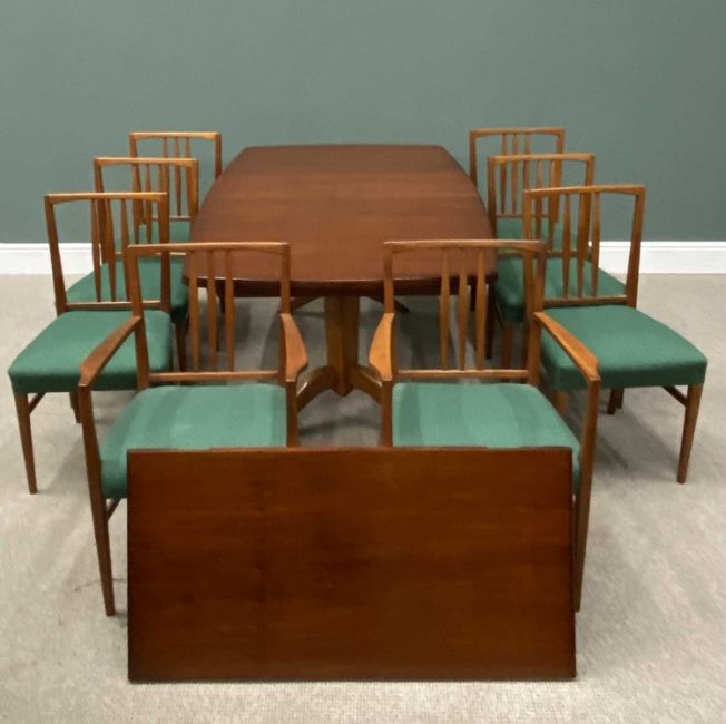 OFFERED WITH LOT 5 - GORDON RUSSELL BURFORD DESIGN MAHOGANY & BOMBAY ROSEWOOD DINING TABLE AND EIGHT (6+2) DINING CHAIRS, CIRCA 1970s, barrel shaped top extending table with additional leaf, on splayed supports with cross stretcher, 74cms H, 177cms approx. L (closed), 53.5cms - the additional leaf, 104cms W, classical design chairs with waisted form spindle backs and stuff over upholstered seats on tapering front supports, 86cms H, 56.5cms W, 42cms seat D - the carvers
