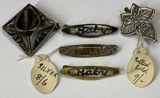 COLLECTION OF EIGHTEEN VARIOUS BROOCHES, to include 2 x silver baby brooches, gilt metal baby brooch, silver mother brooch, Celtic scroll-type silver brooch, 4 x paste and other stone set openwork bar brooches, filigree in silver and other metals, marcasite and others