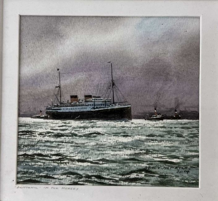 NEIL S HOPKINS (British, 20th Century) watercolour - titled 'Night Sailing', signed lower left, 11.5 x 18.5cms, and 'Britannic in the Mersey', signed and dated lower right, 9 x 9.5cms