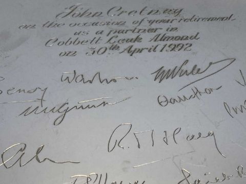 PRESENTATION CIRCULAR SILVER SALVER raised wavy border on three nautilus shell-type feet, the front inscribed 'John Cretney on the occasion of your retirement as a partner in Cobbett Leak Almond on 30 April 1992', along with numerous engraved signatures, 25.5cms diam., 16.7ozt , Sheffield 1991, maker marks 'F A',