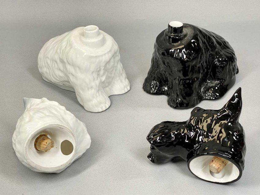 PAIR OF ROYAL ADDERLEY DECANTERS, created exclusively for James Buchanan & Co Ltd, 1970, modelled as a black Scottish terrier and a white West Highland terrier, 21cms H