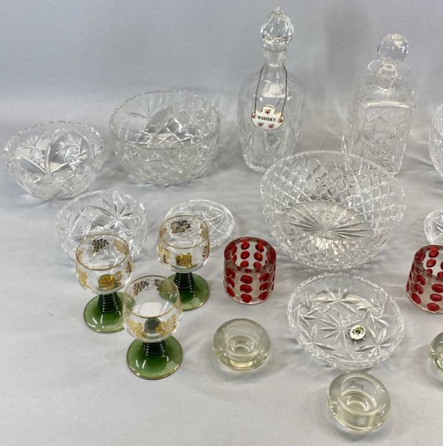 MIXED CUT GLASSWARE, including fruit bowls, decanters and set of six hock glasses, with gilded bowls and green bases and COPELAND SPODE CHINESE ROSE PART TEA SERVICE, APPROX. 28 PIECES, and 5 x Royal Doulton 'Flora Dora' tableware, including circular lidded tureenProvenance: private collection Denbighshire