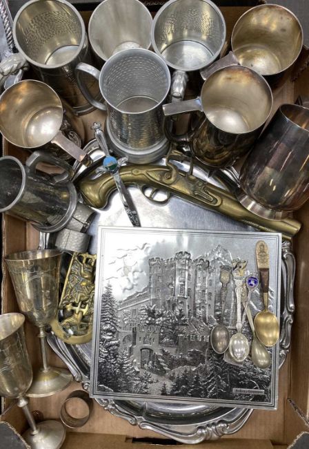 LARGE GROUP OF PLATED HOTEL WARE, EPNS & METAL WARE including tankards, goblets, James Dickson & Sons meat cover etc (within four boxes)