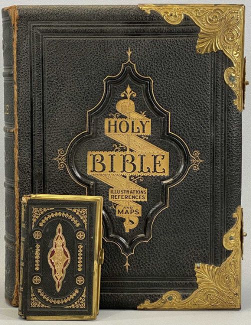 VICTORIAN FAMILY HOLY BIBLE & WELSH TESTAMENT BOOK, the bible having illustrations, references and maps, both items having gilt metal mounts and clasps, 34 x 27cms (the bible)