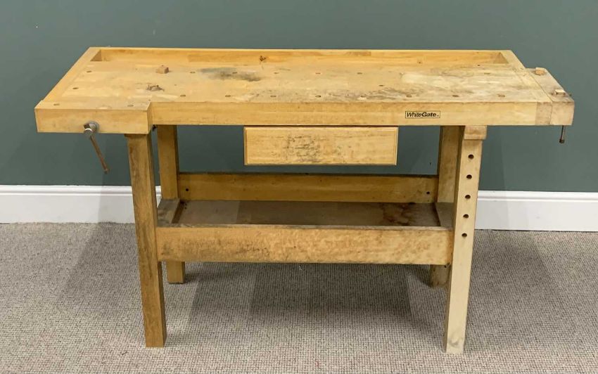 WHITEGATE WOODWORKERS BENCH WITH TWO INTEGRAL VICES, central drawer and undertier work shelf, 87cms H, 146cms W, 50cms D