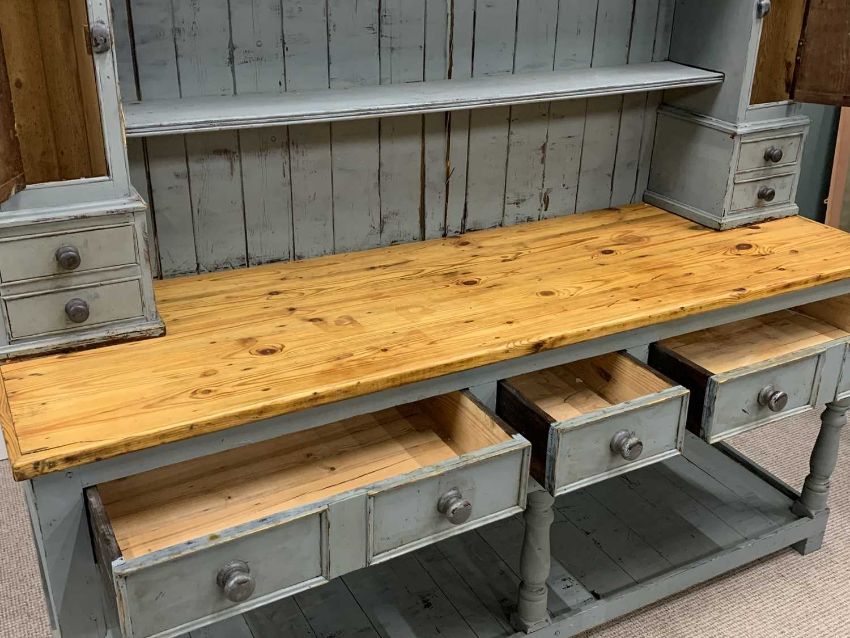 REPRODUCTION COUNTRY HOUSE POT-BOARD DRESSER in painted pine, stripped back top to the base, inverted stepped cornice and pierced frieze to a two-shelf rack, flanked by twin cupboard doors and blind lower drawers, the base section having three opening frieze drawers with turned wooden knobs above a shaped apron, on turned and block supports with a closed back pot board shelf, 228cms H, 207cms max. W. approx. 60cms D