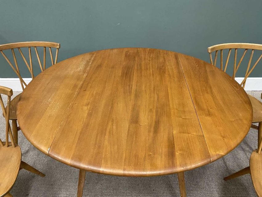 ERCOL BLONDE ELM & BEECH DINING TABLE AND FOUR CANDLESTICK BACK DINING CHAIRS, 71.5cms H, 113cms L, 65.5cms W (closed), 125cms W (fully open), and 80cms H, 41.5cms W, 37cms seat D, all the chairs having a double cross frame stretcher