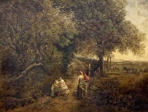 19TH CENTURY ENGLISH SCHOOL oil on canvas - depicting children collecting flowers in a small wheeled truck and a young girl carrying water on a tree lined country lane with cattle in a field, unsigned, 44 x 60cms