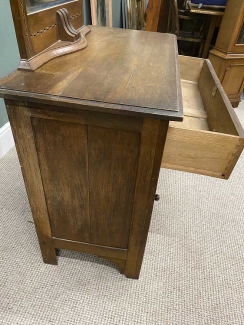 VINTAGE OAK MIRRORED DRESSING CHEST with ebony and boxwood strung inlay, having three long opening drawers with fancy back plates and turned metal knobs, 78.5cms H, chest only, 91.5cms W, 45.5cms D, 63.5cms H, 61.5cms W the mirror