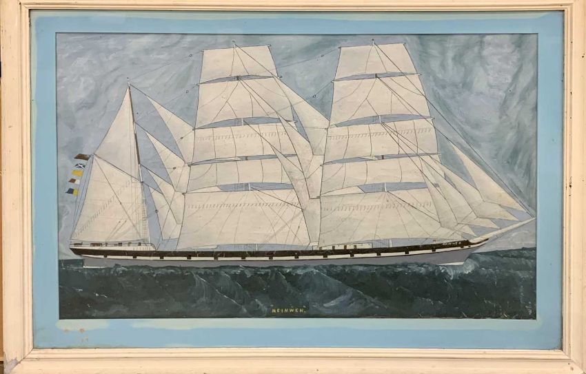 VICTORIAN MARITIME SCHOOL gouache on canvas - entitled 'Meinwen', an iron and steel barque three master in full sail, built 1892, R & J Evans & Co. Liverpool, unsigned, 57 x 91cms, probably a slate clipper, registered in Port Adelaide from 1910