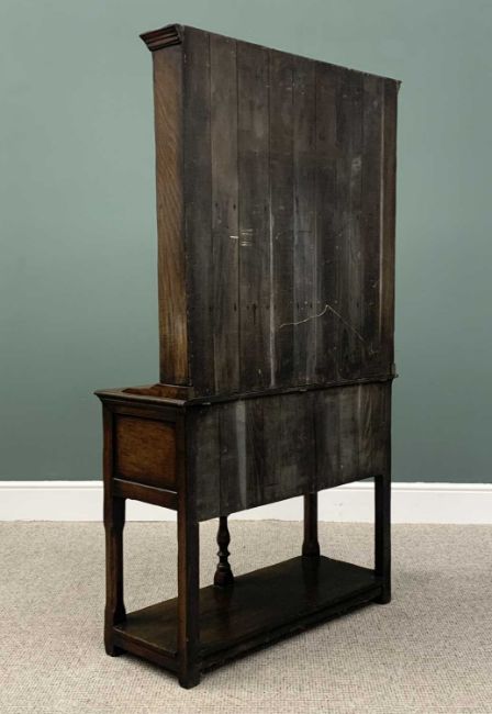 NARROW REPRODUCTION OAK POT BOARD DRESSER, having a two-shelf upper rack with decorative frieze, on a base section of five opening drawers, with fancy back plates and ring pull handles and brass knobs, a further shaped decorative apron on canted and turned supports with an open back pot board shelf, 163cms H, 92cms W, 37cms D