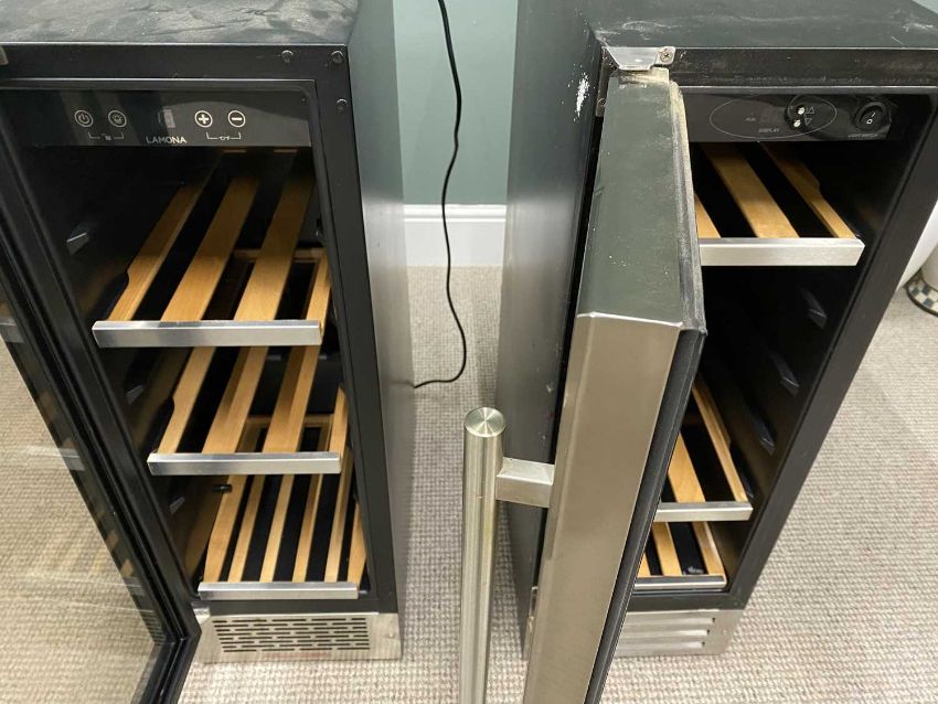 TWO FLOOR STANDING WINE COOLER CABINETS & PANASONIC MULTI-FUNCTIONAL MICROWAVE / OVEN, 86cms H, 29cms W, 57.5cms D the coolers, 33cms H, 51cms W, 53cms max. D the oven, E/T