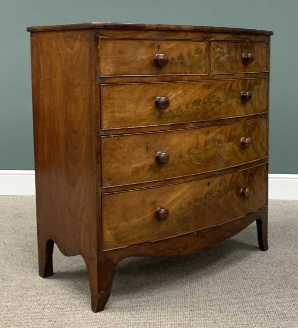 VICTORIAN MAHOGANY BOW FRONT CHEST, two short over three long drawers with turned wooden knobs, on corner bracket feet, 105cms H, 103cms W, 53cms D