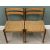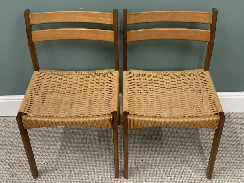 MID-CENTURY SET OF FOUR TEAK DINING CHAIRS BY NIELS MOLLER with cord seats, semi curved backs with shaped uprights and shaped top front supports, no brand labels or stamped details apparent, 79cms H, 47.5cms W, 42cms seat D