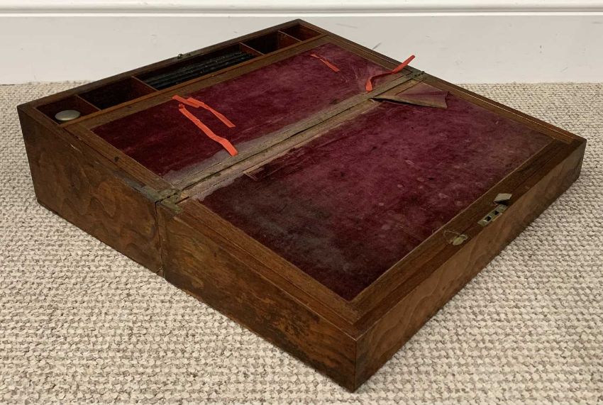 VICTORIAN FIGURED OAK WRITING SLOPE bearing plaque to top 'Fred Chambers, 1885', 20cms H, 54.5cms W, 26.5cms D