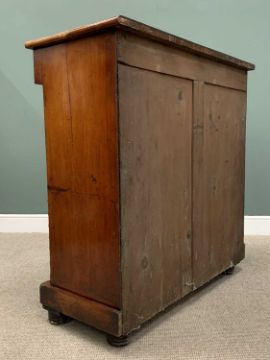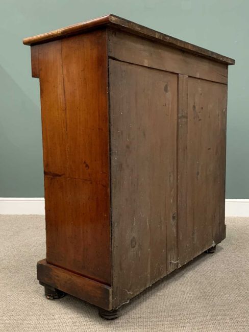 VICTORIAN MAHOGANY CHEST OF SIX DRAWERS, probably Scottish, the inverted breakfront top over a shaped upper secret drawer over two short and three long drawers, all having cockbeaded edging and turned wooden knobs, with mother-of-pearl inset buttons flanked by half cut bobbin and turned detail pillars, on a block base and substantial bun feet, 128cms H, 123cms W, 56cms D