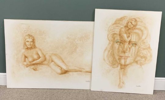 FRANK ARIO large acrylics on canvas on stretchers (2) - reclining nude, signed, 86 x 122cms, and a similar style picture of a lady