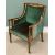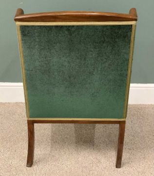 EDWARDIAN INLAID MAHOGANY SALON ARMCHAIR in green velour upholstery, on tapering front supports and brass castors, 89cms H, 61cms W, 49cms seat D