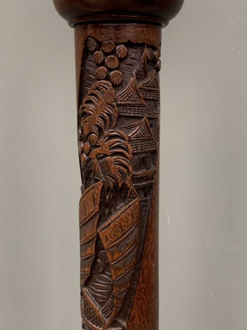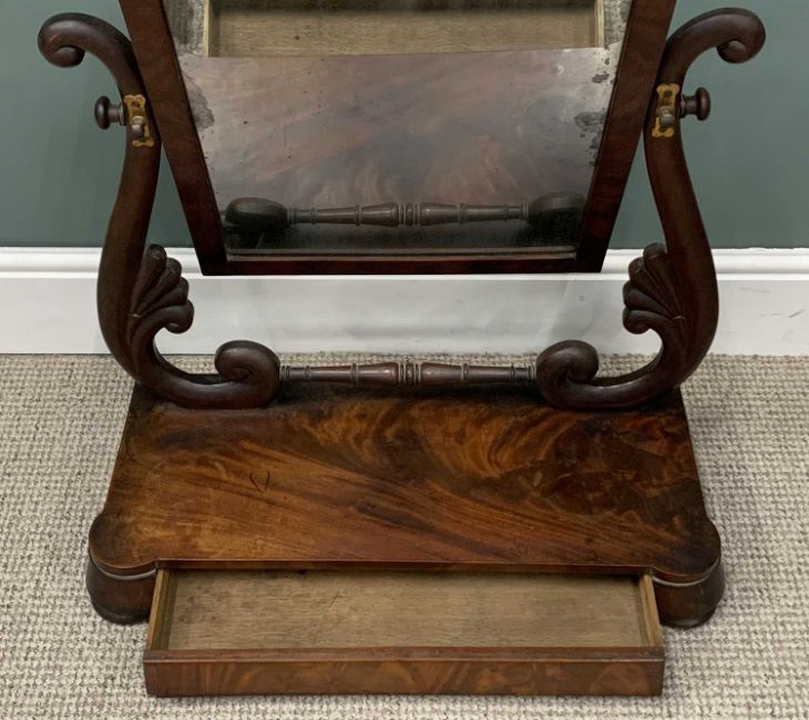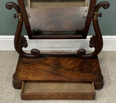 TWO ITEMS OF ANTIQUE & VINTAGE OCCASIONAL FURNITURE, comprising a 19th Century mahogany swing toilet mirror with scroll and fan detailed mirror supports, on a shaped base, with single drawer, on turned bun feet, 82cms H, 66cms W, 29cms D, and a later carved Chinese hardwood standard lamp on a stepped circular base, 165cms H (incl. fitting)