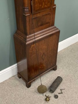 OAK & MAHOGANY LONGCASE CLOCK circa 1840, Newark maker, having an arched top painted dial, depicting a farmer with plough and cottages to the spandrels, the white dial set with Roman numerals and subsidiary seconds dial before a now single weight pendulum driven bell strike movement (pendulum and weight included), the case with broken swan neck pediment over a single arched glazed door, flanked by turned pillars, the cross banded oak and mahogany case with a shaped top trunk door flanked by quarter cut pillars, on a stepped trunk base with corner bracket feet, 220cms H, 50cms W, indistinct makers name and the town of Newark painted to the dial