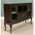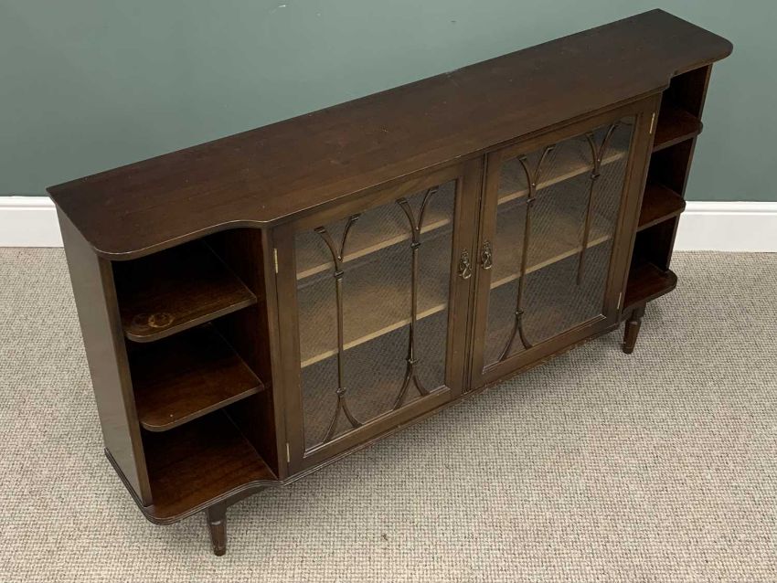 VICTORIAN MAHOGANY SIDE CABINET BASE & ONE OTHER, the Victorian example having blind and open fretwork detail with column support to a central shelf above a single cupboard door, flanked by twin glazed doors with interior shelving, on Queen Anne supports, 102cms H, 137cms W, 40cms D, the other being reproduction mahogany having shaped open end shelves and twin central beaded glazed doors, with interior shelving, on canted supports, 86cms H, 152cms W, 30.5cms D
