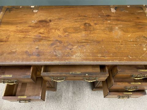 EDWARDIAN MAHOGANY TWIN PEDESTAL DESK / EX DRESSING CHEST, with a rectangular top and kneehole centre section with an arrangement of nine opening drawers, all having fancy brass back plates and swing pull handles, on corner bracket plinth bases, 81cms H, 127cms W, 55cms D