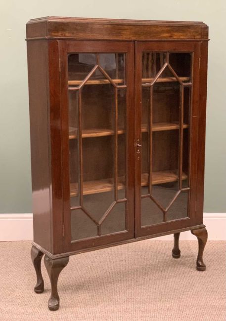 TWO ITEMS OF VINTAGE FURNITURE, comprising an oak six-drawer chest with decorative back plates and pull handles to the drawers, on stile feet, 123cms H, 76cms W, 45cms D, and a two-door mahogany bookcase / display cabinet with interior adjustable shelves and seven pane astragal glazed doors on Queen Anne supports, 126cms H, 88cms W, 25cms D