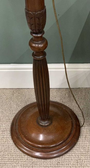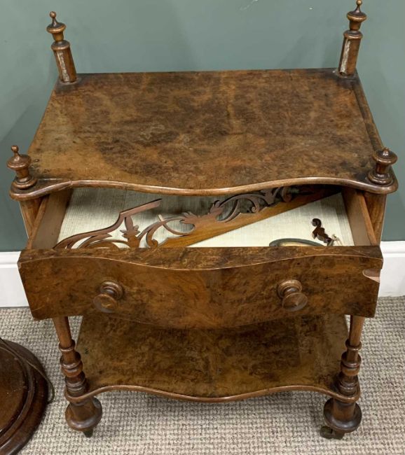GROUP OF ANTIQUE / VINTAGE FURNITURE comprising a burr walnut serpentine front single drawer whatnot on brass castors, mahogany three-tier folding cake stand, reeded column standard lamp with shade, Victorian mahogany covered bidet on turned supports, and a long handled copper warming pan, various measurements