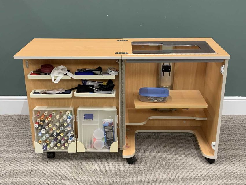 MODERN SEWING MACHINE & MULTI-FUNCTIONAL WORK CABINET, Husquarna Viking 425 Freesia electric sewing machine and the contents of the cabinet, 76cms H, 60cms W (closed), 44cms D, 120cms W (fully open) the cabinet, E/T