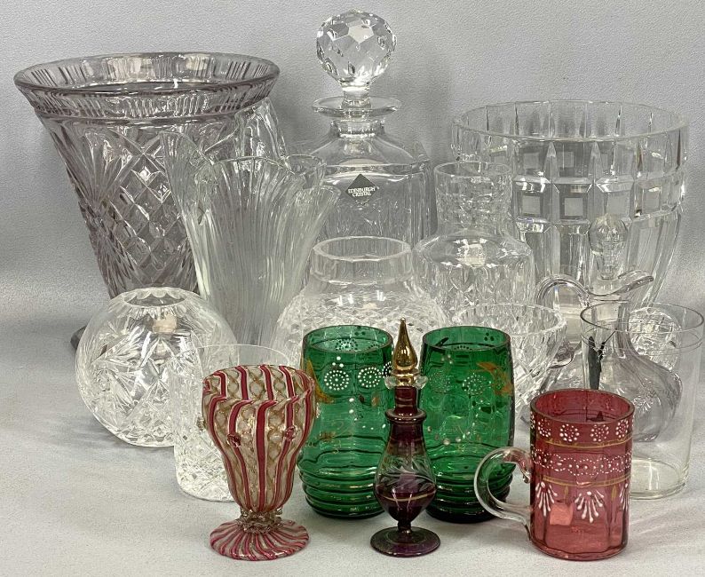 SQUARE GLASS DECANTER & STOPPER, 26cms H, heavy cut glass vase, 17cms H, cut glass water carafe and tumbler, 18cms H, drinking glass with pink striped and gold decoration, 9cms H, with other items