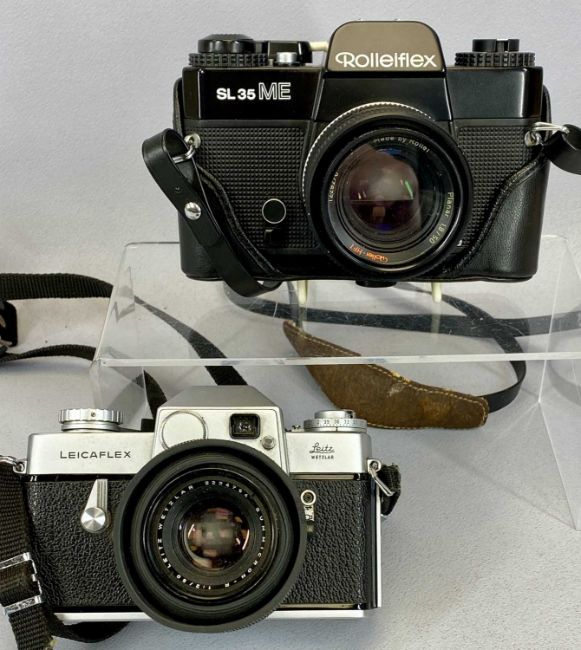 ROLLEIFLEX SL35 ME CAMERA, with Rollei lens and a Leitz Wetzlar Leicaflex camera