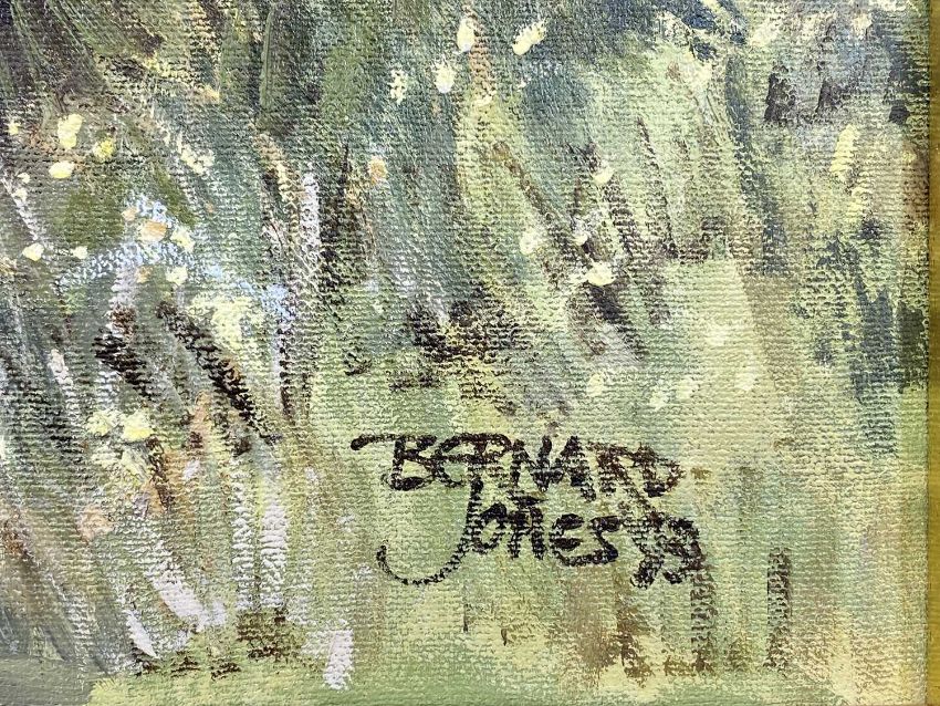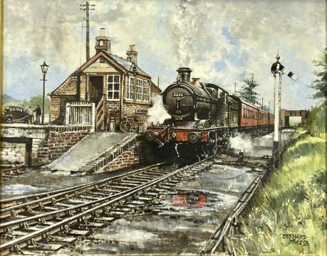 BERNARD R JONES (British, 20th Century) oil on canvas - steam train at station, titled verso 'Collett 0-6-0 at Fairford on G.W.R', signed lower right, 39.5 x 49.5cms
