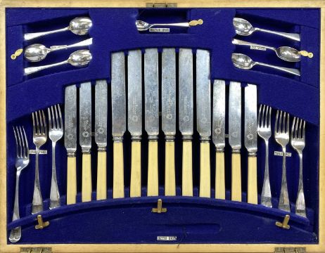 OAK CASED CANTEEN OF EPNS A1 CUTLERY & ACCESSORIES, APPROX. 52 PIECES, the fish servers with silver ferrules