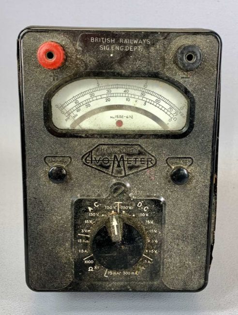 RAILWAYANA: FOUR VARIOUS RAILWAY RELATED METERS, to include a Cambridge Instrument Co. galvanometer, stamped to the back 'LMSR Telegraph Department Crew', 10cms diam., larger brass cased instrument stamped to the front 'L&NWRLY Telegraph Department', with a further plaque saying 'Electrical Department Stafford, no. 235', 17cms diam., Bakelite cased Avometer marked 'British Railways SIG.ENG.DEPT.', 18 x 13cms, and one other in polished steel, no rail related markings, numbered to the back 408 and 512, with small wooden transportation case