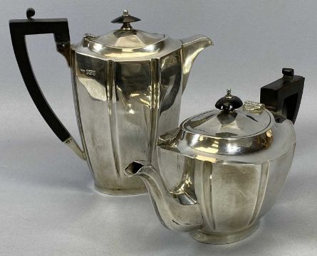 GEORGE V SILVER FOUR-PIECE TEA SERVICE of oval panelled form, teapot and hot water pot with ebonised handles and finials, teapot, 14cms H, approx. 57ozt, Sheffield 1928, maker George Wish