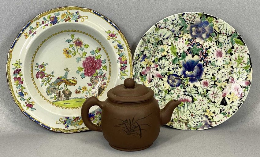 ORIENTAL & OTHER CERAMICS, including small Chinese blue and white vase of baluster form, decorated with dragons and flowers, character mark to base, 14cms H, Chinese terracotta teapot, seal mark to base, 12cms H, Chinese Famille Rose plates, the largest 23cms diam, and other items