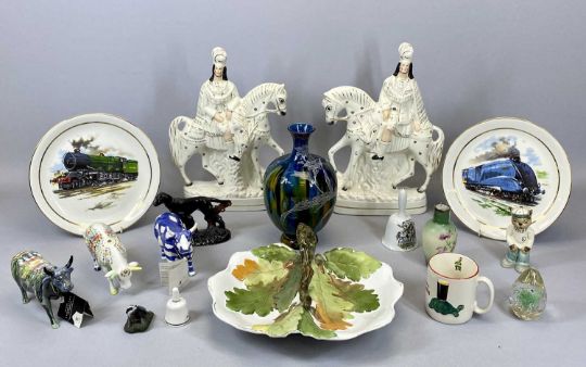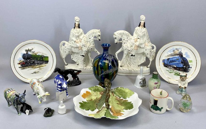 MIXED POTTERY & PORCELAIN COLLECTERS GROUP, to include a pair of Staffordshire flat back Scotsman on horseback figures, 37cms H, 3 x cow parade figurines, 16cms L, Guinness advertising mug, 9cms H, Victorian relief moulded nut dish, 32cms across, and other items of interest