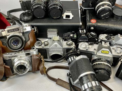 COLLECTION OF SLR CAMERAS WITH LENSES, makes including Canon AV1, Nikon EM, Pentax Spotmatic, Zeiss Ikon, Nikkomat, Olympus OM1, Miranda Sensomat, Pentax MG, and others