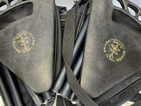 GOLFING INTEREST COLLECTABLES GROUP, comprising 2 x 1989 Ryder Cup shooting stick-type tripods with canvas holders, 1981 4th European Open Hoylake Royal Liverpool Golf Club plaque, 3 x tankard, 2 x goblets, and a small ashtray, presentation items for Helsby Golf Club, 2 x white painted wooden stools and a pair of swift 10x50 high resolution binoculars
