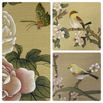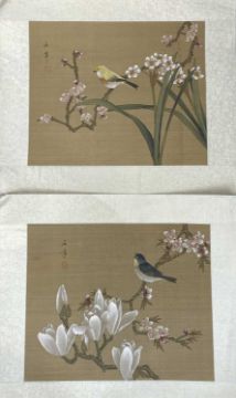 SIX CHINESE PAINTED SILK PANELS, depicting birds or butterflies on blossoming branches, each having character script to the outer edges, 4 x measuring 35 x 40.5cms, and 2 x measuring 50.5 x 20cms (incl. outer borders)